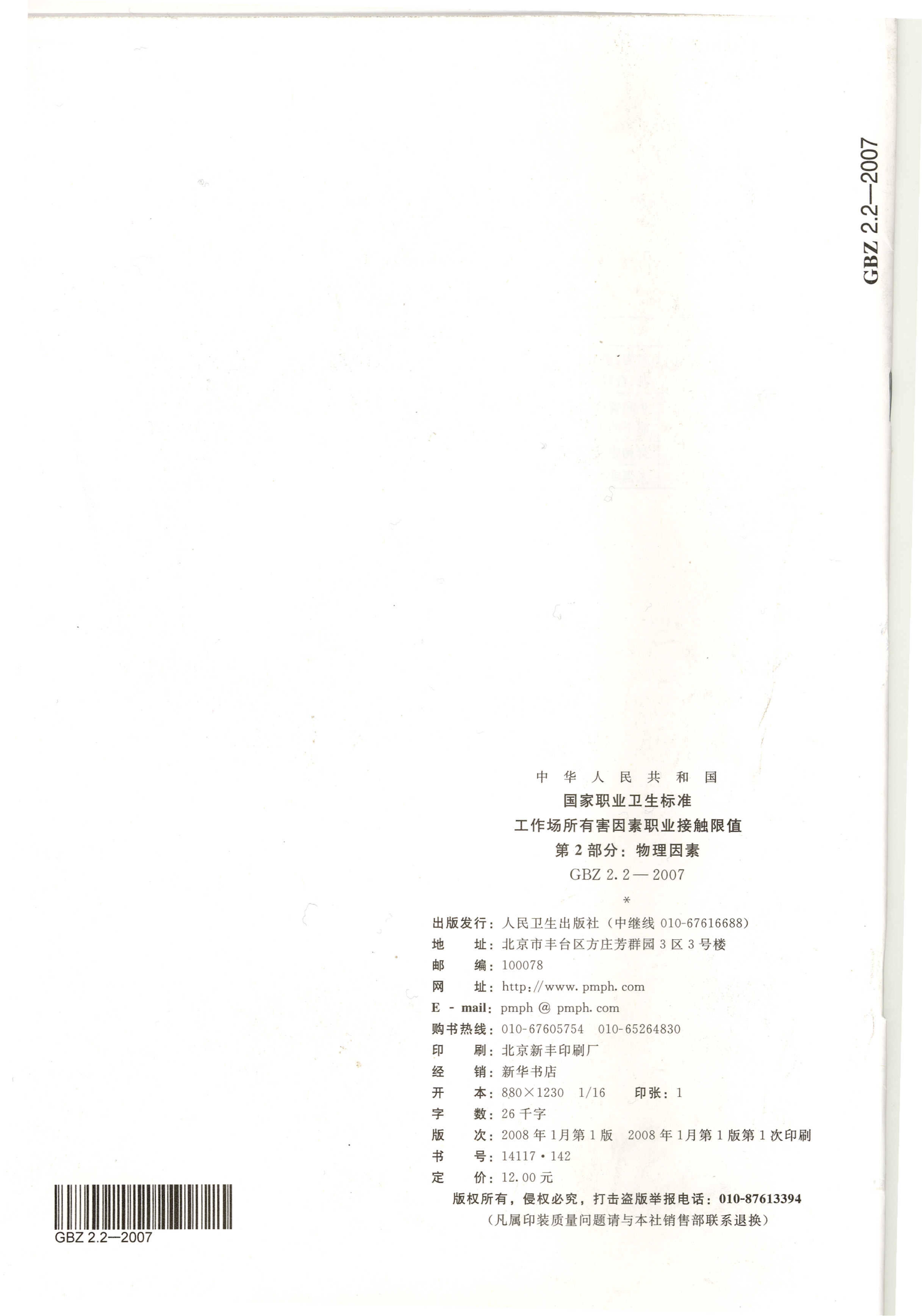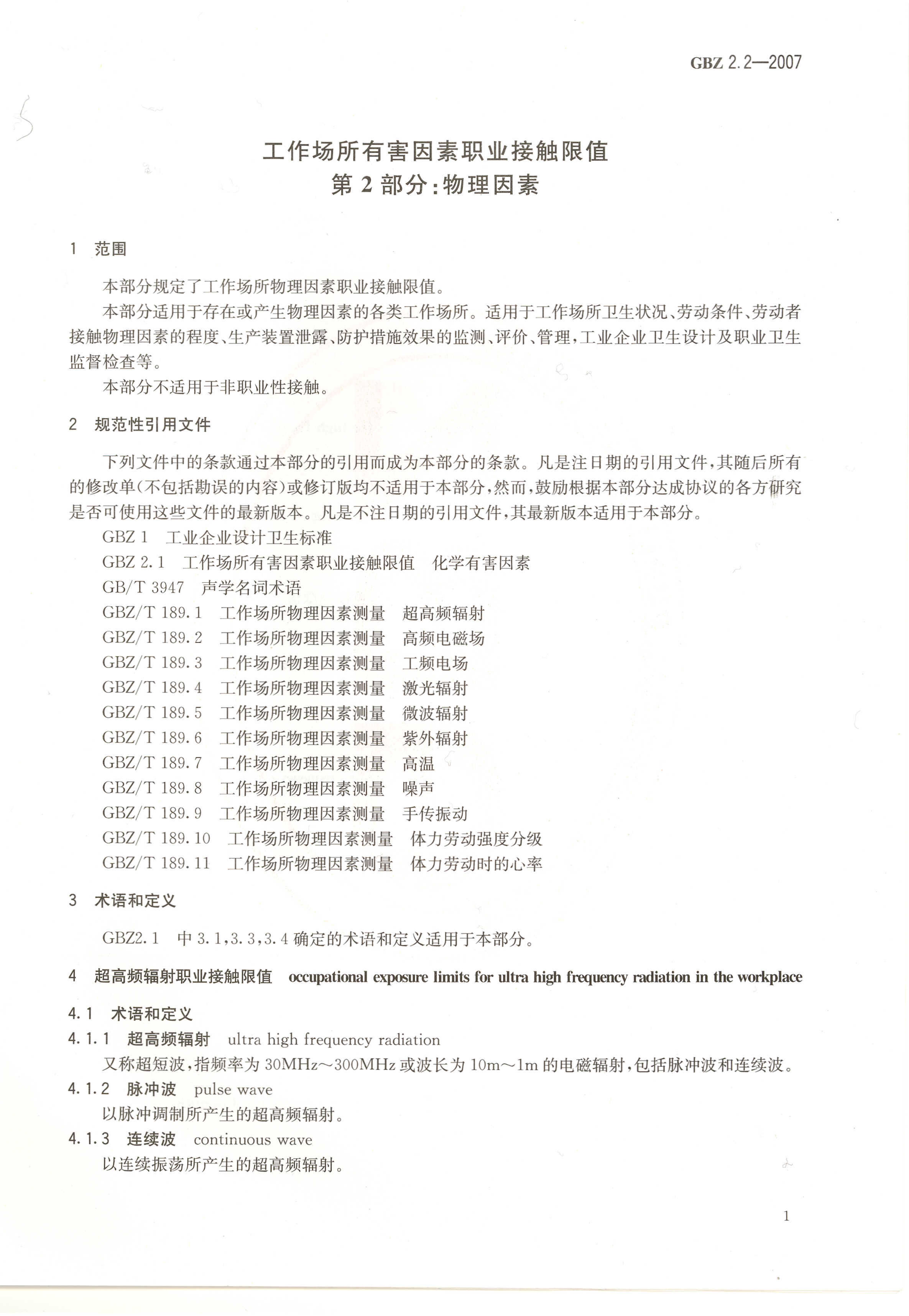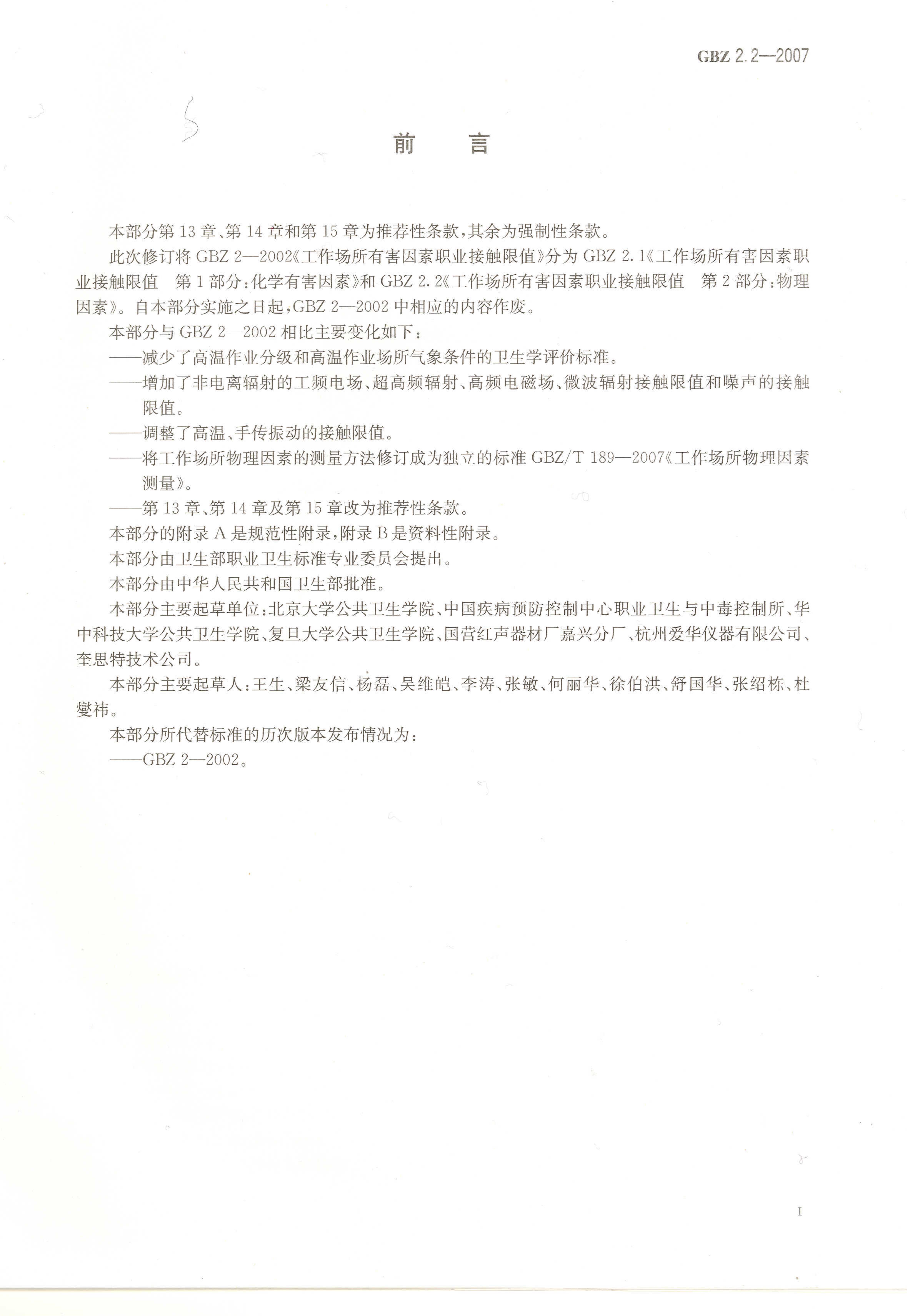 GBZ2.2-2007 职业接触限值 第2部分:物理因素